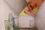 (wnętrze pokoju bez okien; w przeciwległej ścianie znajdują się drzwi; w pokoju stoi tylko jedno krzesło, na którym siedzi długonosy człowiek; sufit rozchyla się i pojawia się twarz z imponującym uzębieniem)