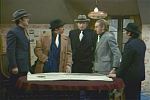 (wnętrze pokoju, na środku którego stoi okrągły stół, na którym leżą jakieś plany; przy stole stoi trzech gangsterów: szef, Ken [Graham Chapman] i Larry; czwarty - Reg - siedzi przy stole, a piąty - Vic - stoi przy oknie i obserwuje teren)