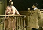 (spostrzega, że nikt - oprócz niego - nie śpiewa, a zebrani w sali patrzą na niego jak na wariata; powoli, zdziwiony idzie w kierunku swojego miejsca; jeszcze raz, nieśmiało wykonuje ruchy naśladujące pracę tłoków w lokomotywie parowej i wydając cichy, powolny dźwięk "Buuu" naśladuje gwizd lokomotywy parowej, z równoczesnym pokazaniem tej czynności; wraca na swoje miejsce; za nim podąża rycerz w zbroi z oskubanym kurczakiem; siada na swoje miejsce; rycerz też i uderza adwokata kurczakiem w głowę; cięcie)